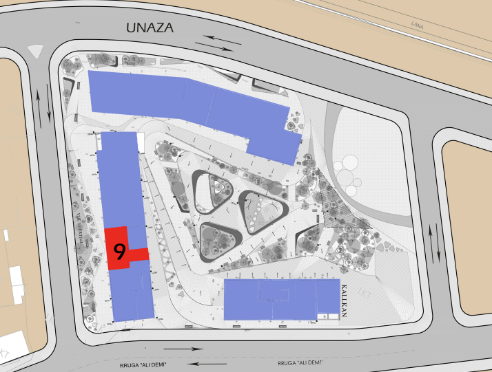 Njësia e shërbimit 9 ndodhet në katin zero të ndërtesës dhe ka një sipërfaqe neto prej 137.2m² dhe sipërfaqe të përbashket prej 0.82m². Kjo njësi ju ofron mundësi të shkëlqyera për zhvillimin e biznesit tuaj në një zonë të frekuentuar, duke ju ofruar ekspozim maksimal në fasadën e objektit dhe akses direkt lëvizjeje.