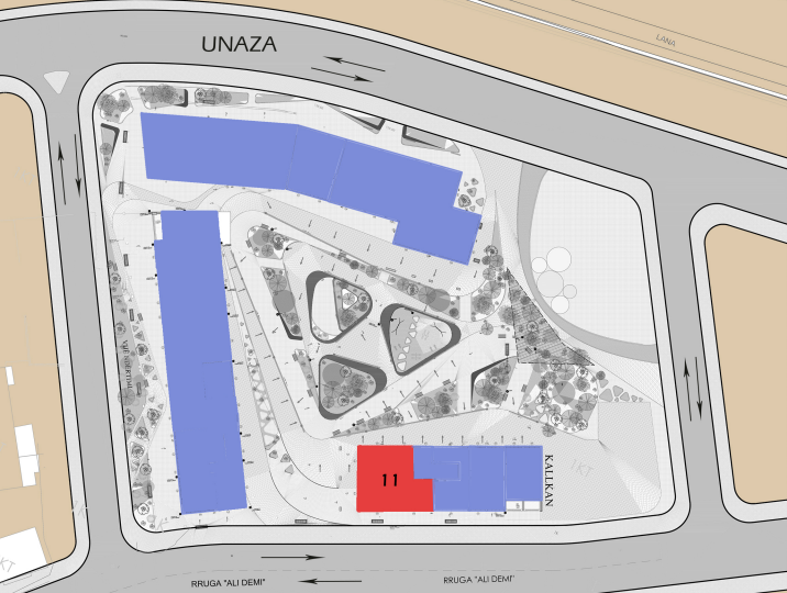 Njësia e shërbimit 11 ndodhet në katin zero të ndërtesës dhe ka një sipërfaqe neto prej 199.08m² dhe sipërfaqe të përbashket prej 1.19m². Kjo njësi ju ofron mundësi të shkëlqyera për zhvillimin e biznesit tuaj në një zonë të frekuentuar, duke ju ofruar ekspozim maksimal në fasadën e objektit dhe akses direkt lëvizjeje.