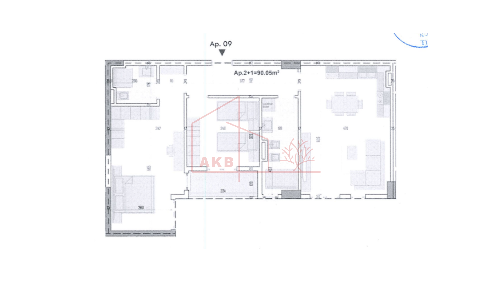 Apartamenti ka një sipërfaqe neto prej 90.05 m² dhe 13.96 m² ambient shtesë, i organizuar në mënyrë funksionale me sallon + kuzhinë, dy dhoma gjumi, tualet dhe ambient ndihmës.