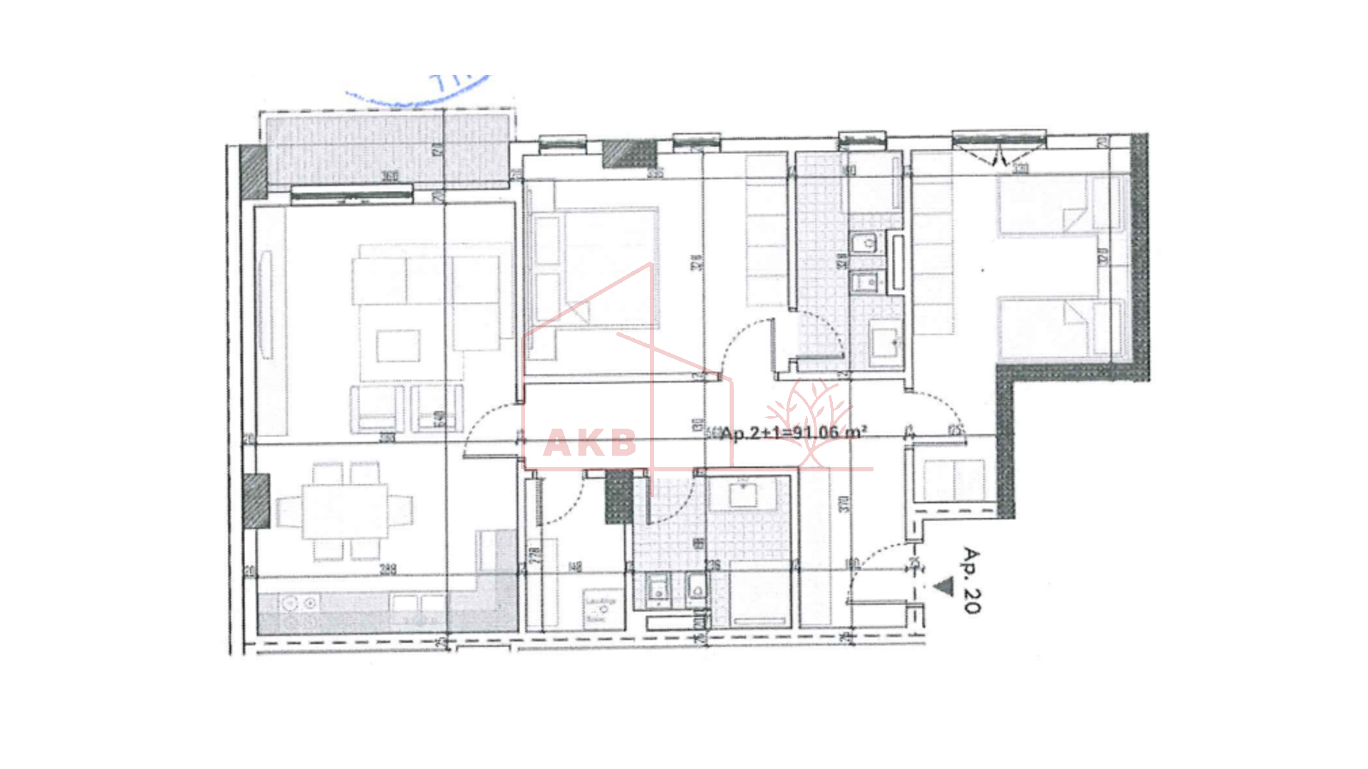Apartamenti ka një sipërfaqe neto prej 91.06 m² dhe 14.11 m² ambient shtesë), i organizuar në mënyrë funksionale me sallon + kuzhinë, dy dhoma gjumi, tualet dhe ambient ndihmës.