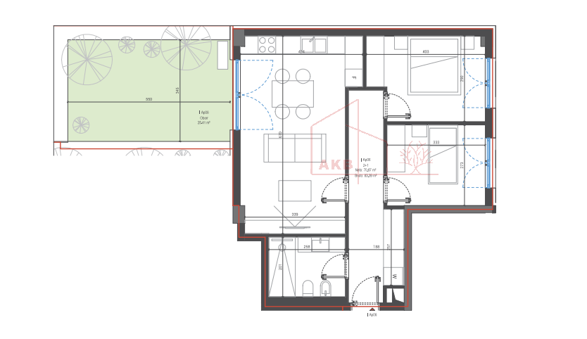 Apartamenti ka një sipërfaqe neto prej 70.67 m², 12.72 m² sipërfaqe të përbashkëta, si dhe një verandë prej 25.41 m², ideale për relaks, ambient ngrënieje apo shijim të hapësirës së jashtme.