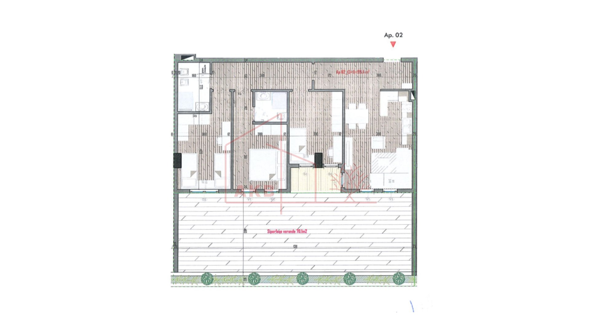 Apartamenti ka një sipërfaqe neto prej 99.4m², 17.59m² sipërfaqe të përbashkët, si dhe një verandë shumë të bollshme prej 70.1m², e cila ofron hapësirë ideale për relaks, kënd pushimi, ose organizime familjare në ambient të hapur. Falë pozicionimit në katin përdhe dhe verandës së madhe, apartamenti ofron ndjesinë e një shtëpie me hapësirë të jashtme private.